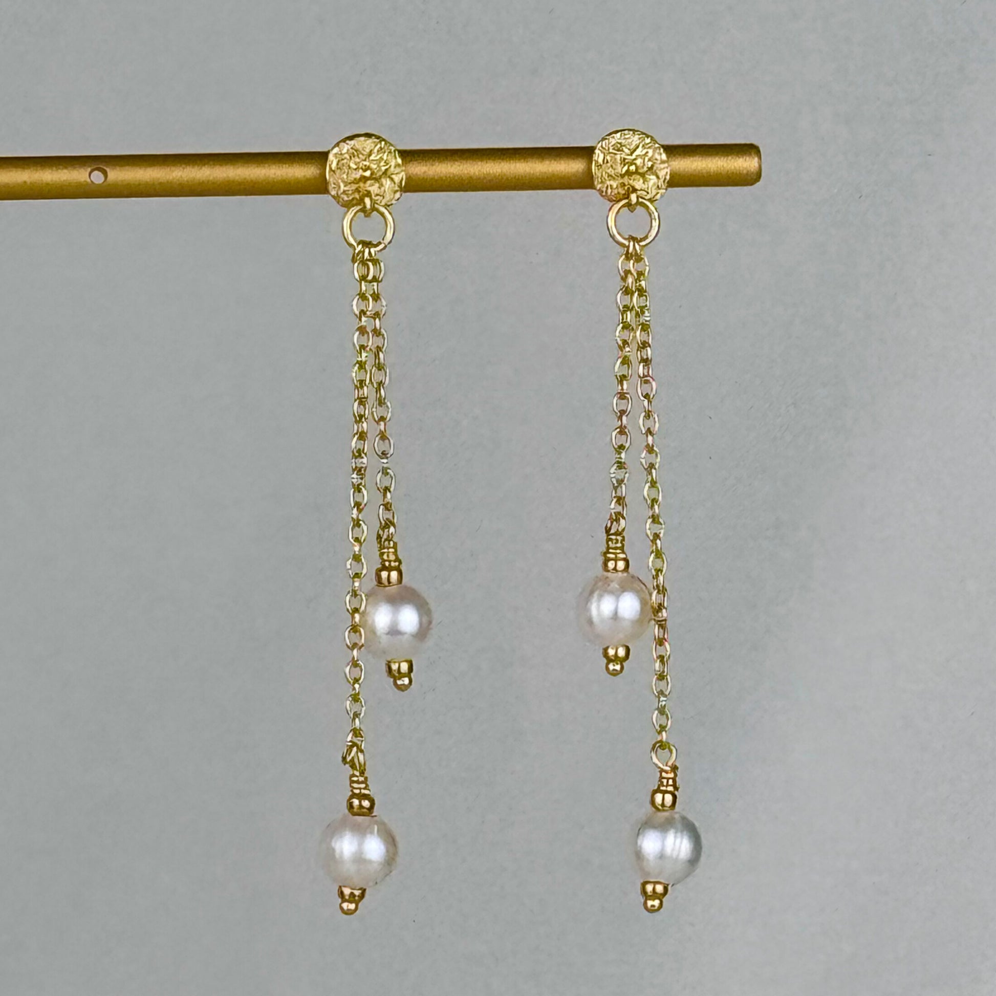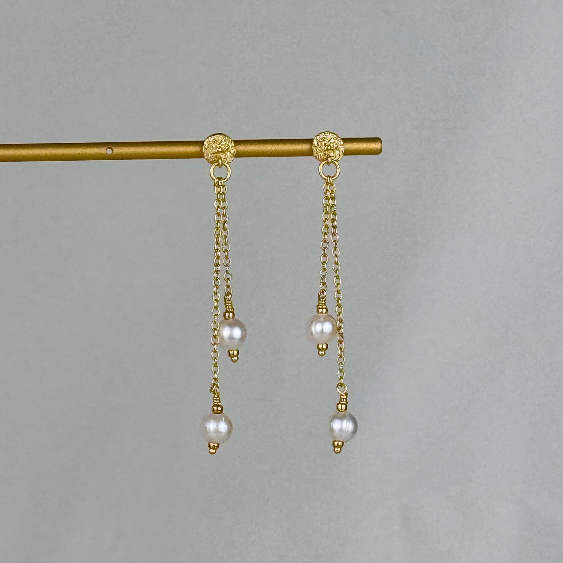 Disse rustikke Hannah ørestikker i forgyldt sterling sølv er skabt til dig, der værdsætter diskret luksus og personligt udtryk. Hver ørestik bærer to fine kæder i forskellige længder – og for enden af hver kæde sidder en naturlig ferskvandsperle, nøje udvalgt for sin unikke form og organiske skønhed. Intet par er ens, og netop det gør dem til noget ganske særligt.