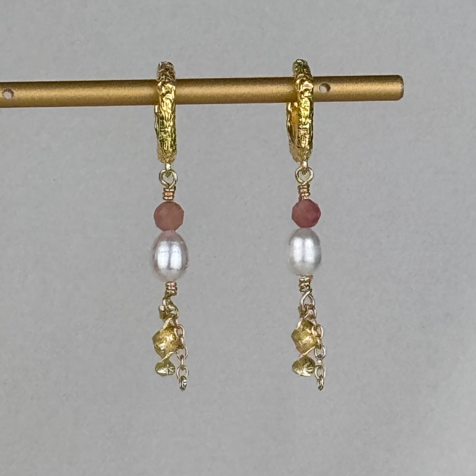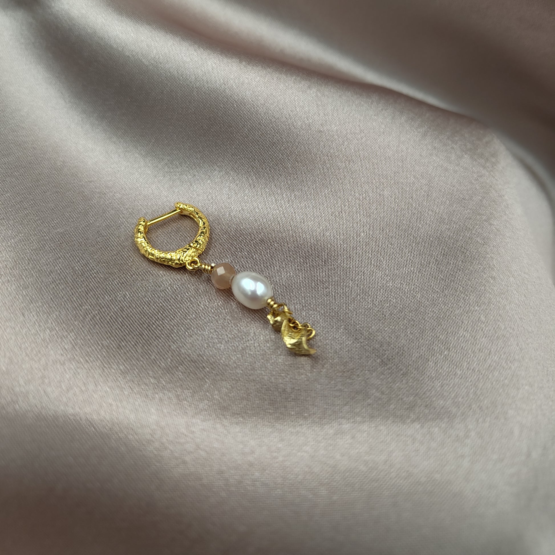 Forestil dig et par øreringe, der kombinerer rå elegance med tidløs skønhed – det er præcis, hvad Klara-øreringene tilbyder. Med deres hængslede, hamrede ørestik og vedhæng af rosa-orange solsten og ferskvandsperle udstråler de en raffineret tekstur og naturlig charme. Designet fuldendes med et snoet vedhæng og en fin kæde, der skaber en dynamisk bevægelse og et udtryk, der aldrig går af mode.