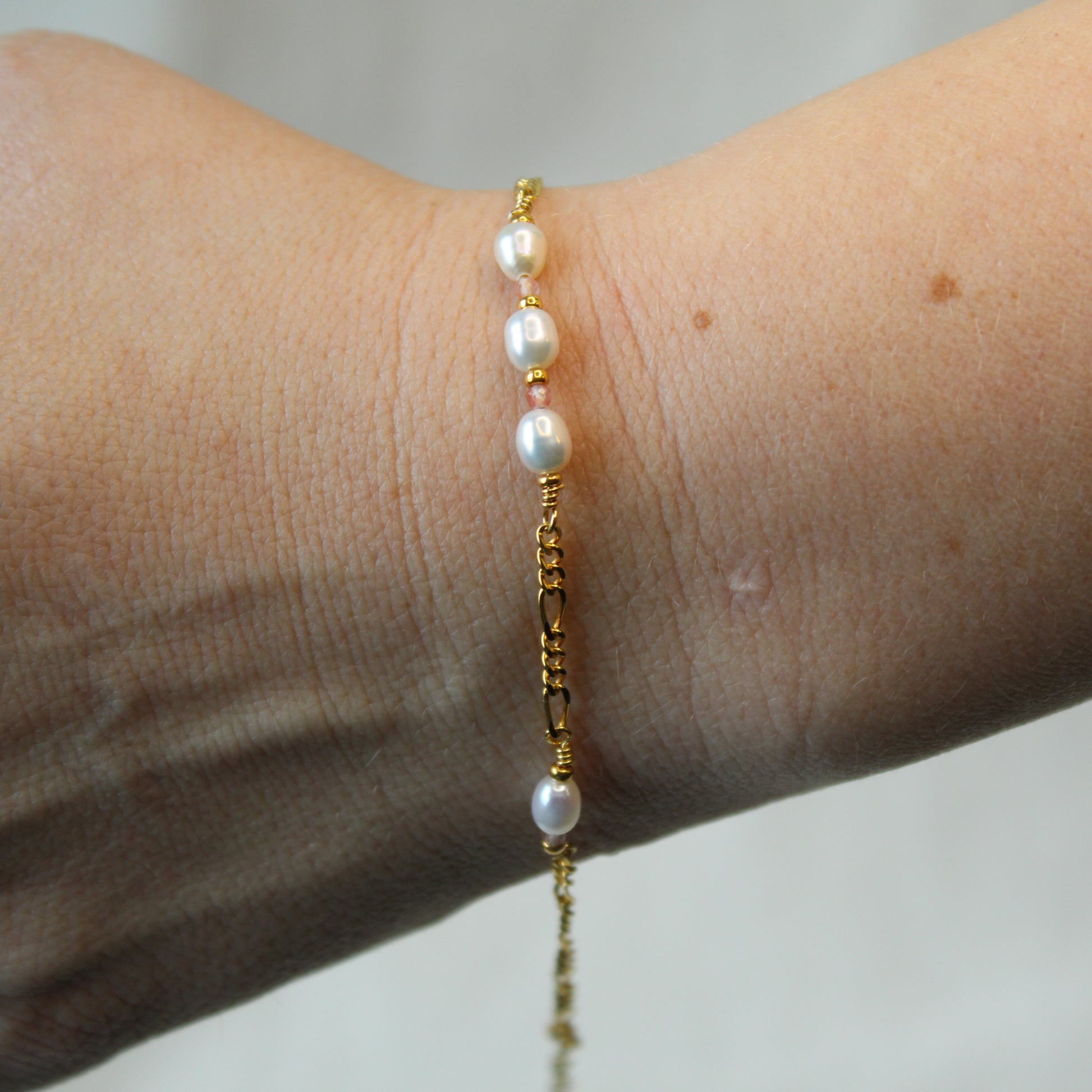 Dette elegante armbånd kombinerer tidløs charme med et moderne twist. Designet med en klassisk figarokæde og udsmykket med flere vedhæng af naturlige ferskvandsperler og rosa-orange solsten, skaber det en smuk balance mellem rå elegance og feminin finesse.